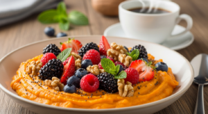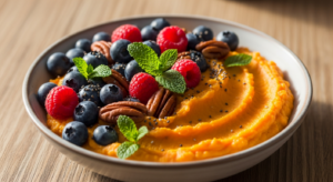 Elevate your energizing breakfast bowls by presenting them in clear glass bowls or shallow ceramic dishes to showcase the stunning, warm orange base contrasted with jewel-toned berries and golden nuts. Complement this wholesome dish with a steaming cup of chai tea or freshly brewed coffee for a balanced morning ritual. Drizzle a little extra maple syrup or swirl in a spoonful of nut butter for indulgence.Sweet Potato